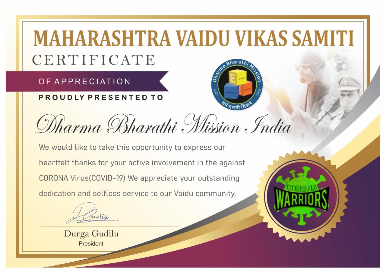 Maharashtra Vaidu Vikas Samiti Certificate Of Appreciation Proudly Present To Dharma Bharathi Mission ! RELATED POSTS Congratulate our students on their achievement of getting placed in Activity The 5th Narayan Verma Memorial Lecture Meeting: “COVID-19, Now, Next & Beyond, A Discussion” in Activity Scholarships Worth 3 Lakhs Disbursed for Meritorious Students in Activity